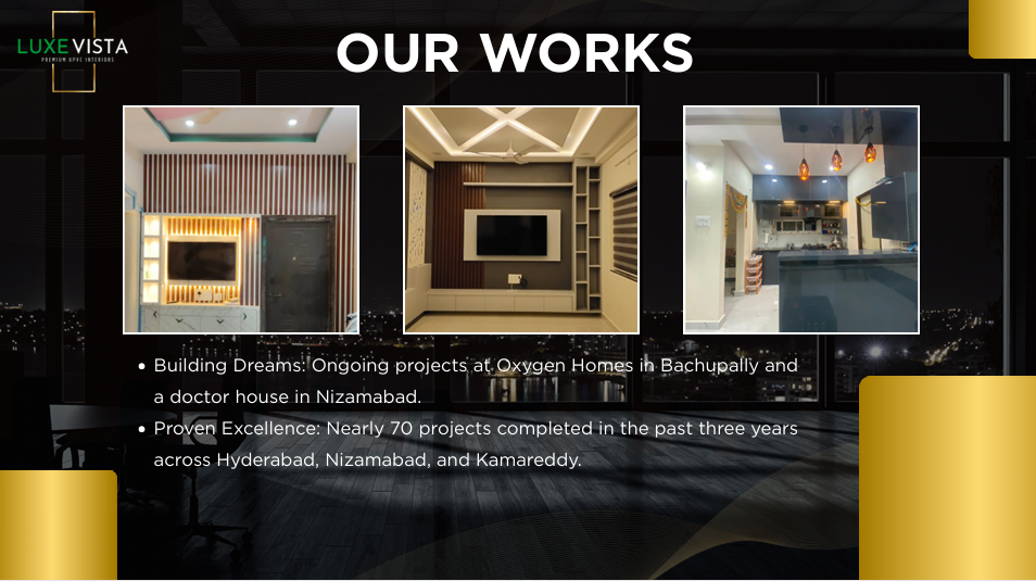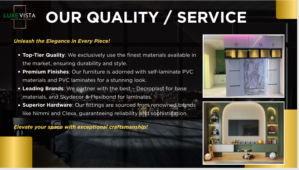 Our design philosophy blends innovation, practicality, and sustainability, creating living spaces that are both visually stunning and built to endure. Whether itβs a sleek modular kitchen, an elegant wardrobe, or a bespoke entertainment unit β every project at LuxeVista is tailored to perfection.